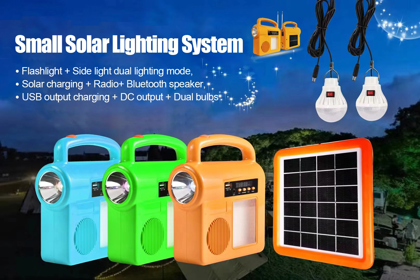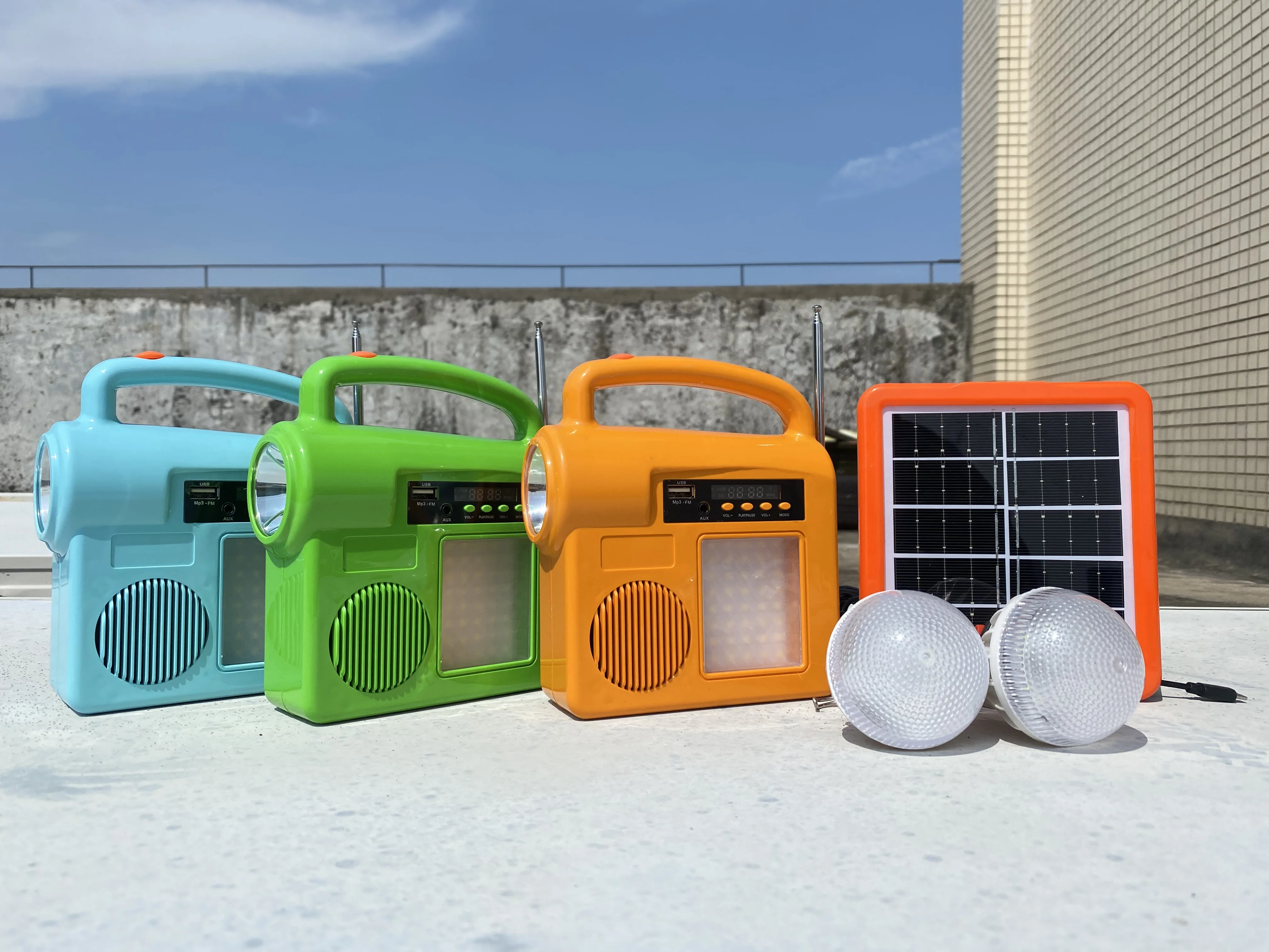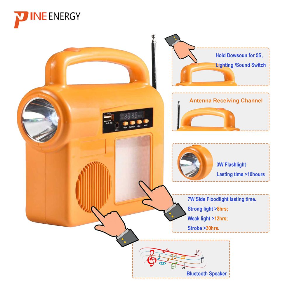 The portable solar lighting system is multi-functional, support led flash lighting, led flood lighting, bluetooth audio, radio and USB charging for small electronic devices. It is widely used to outdoor camping, picnic, hiking, travel, rural activities and so on.