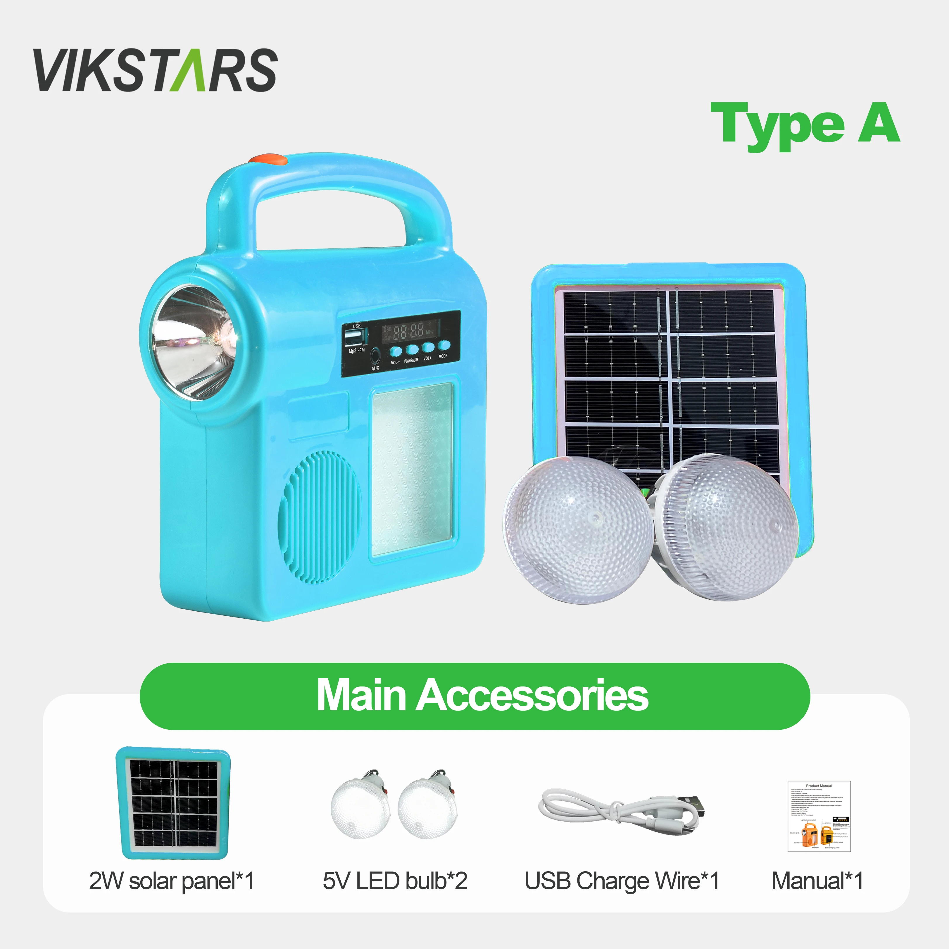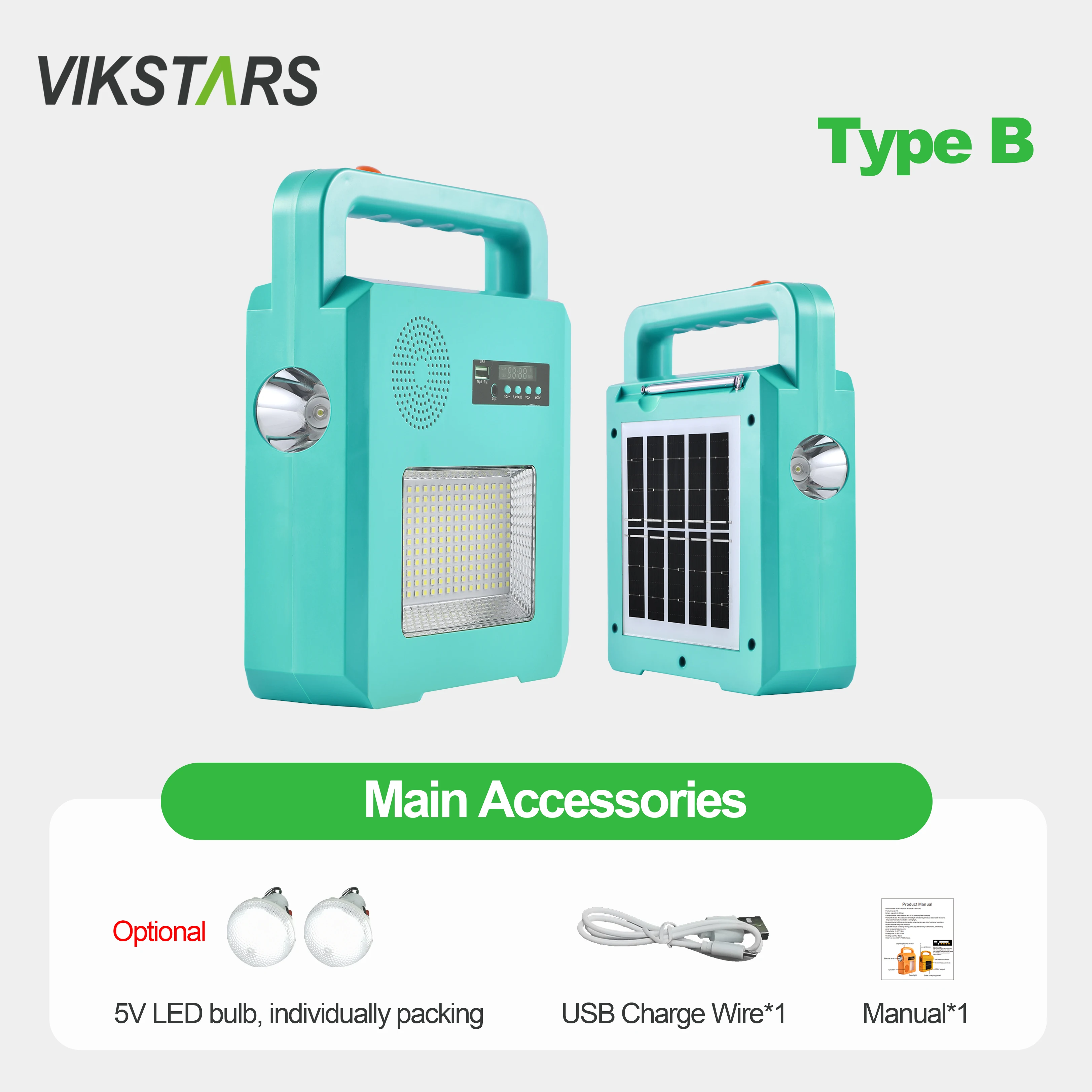 Main Accessories | Addictional 2W solar panel*1 + 5V LED bulb*2 +USB Charge Wire*1 + Manual*1 | Charge Wire*1 + Manual*1 (5V LED bulb optional, individually packing) |