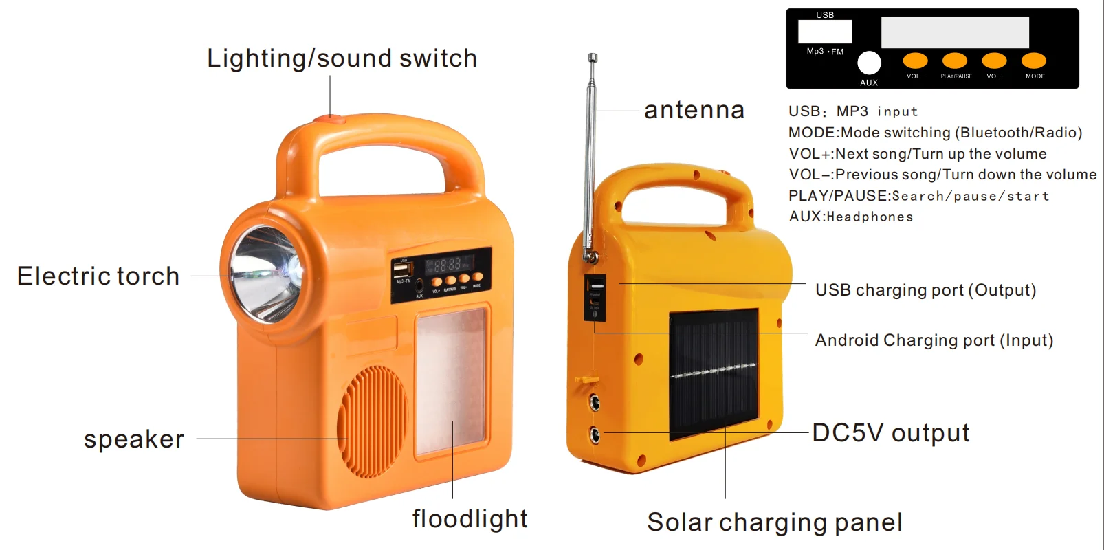 Support Function | ① 3W flashlight ② 7W side floodlight ③ 5V/1A USB output port ④ Bluetooth audio ⑤ FM radio ⑥ Solar charger | |